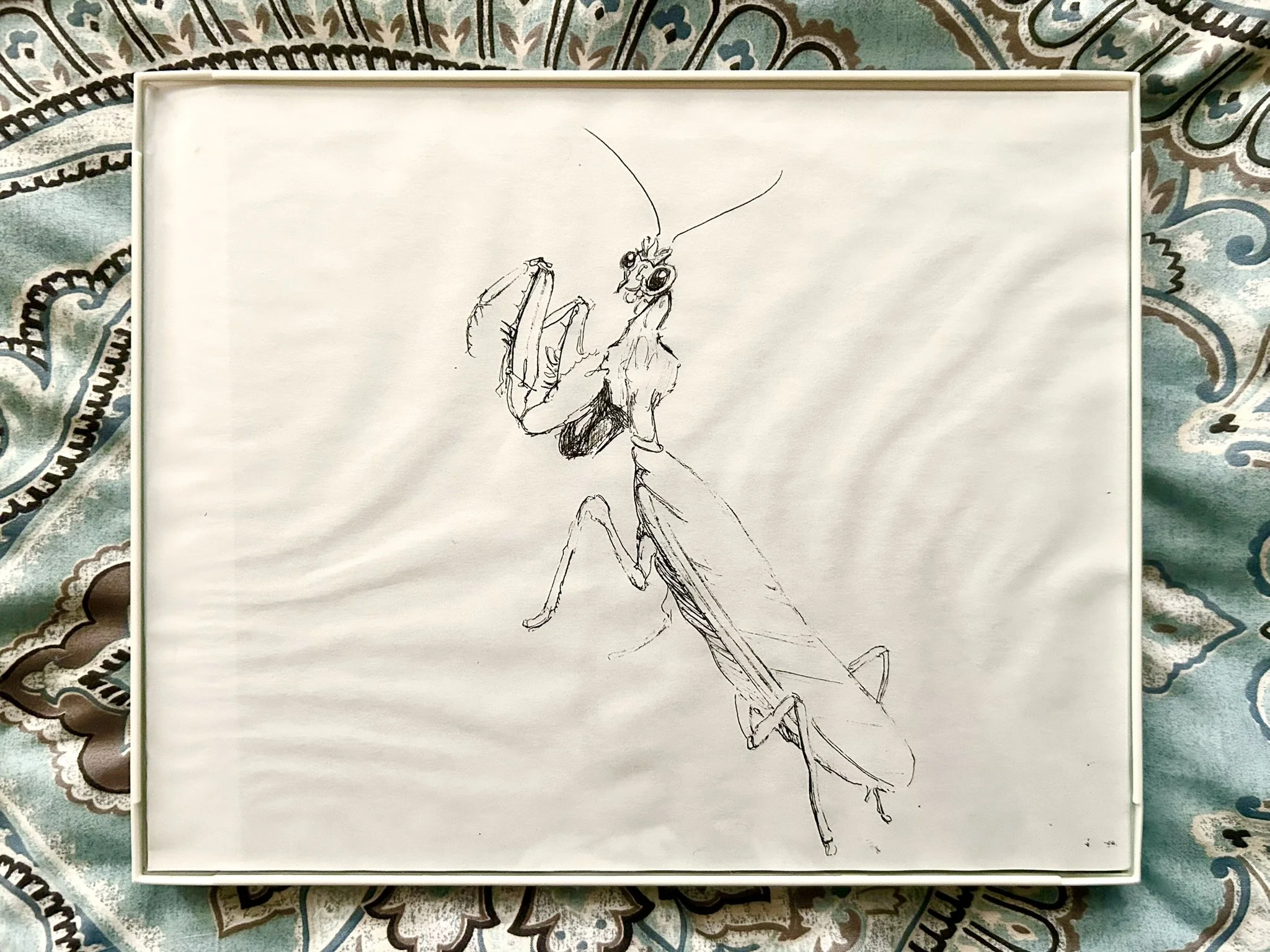 2025. Praying Mantis Drawing from 1965 Spanish Sahara Stamp. 8 x 10 in. Pen on paper