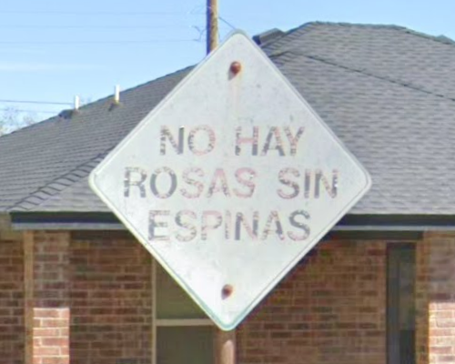 Santa Fe Station Feb 4 Written By Gilbert Zamora 500x400 - Image from Apr. 2023Last seen Apr. 2023Pink text & green border on white background ? NO HAYROSAS SINESPINAS Pink on whiteSpanish Gilbert Zamora